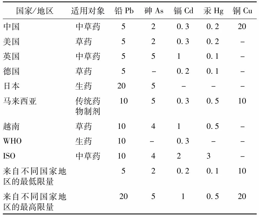自20世纪90年代,中药材中重金属限量问题就已受到世界各国各地区的关注,很多国家和地区对重金属含量制定了明确的限定标准。但由于对中药的重金属限量缺乏统一的认识与标准,世界各国、各地区对进口的中药实行各自的限量标准,要求不尽相同。《欧洲药典》、《美国药典》、WHO的 《中药污染物和残留物标准》、《英国药典》、《韩国药典》、《日本药典》、《香港中药标准》、《中国药典》和 《中国药用植物及制剂进出口绿色行业标准》等均对中药材重金属含量制定了明确的限量标准,如表所示。